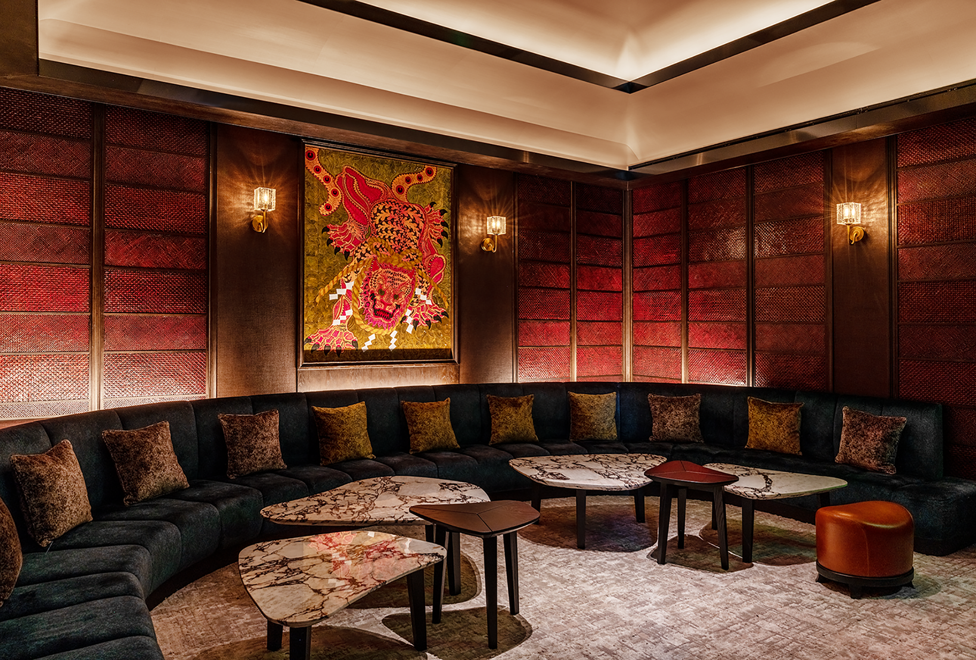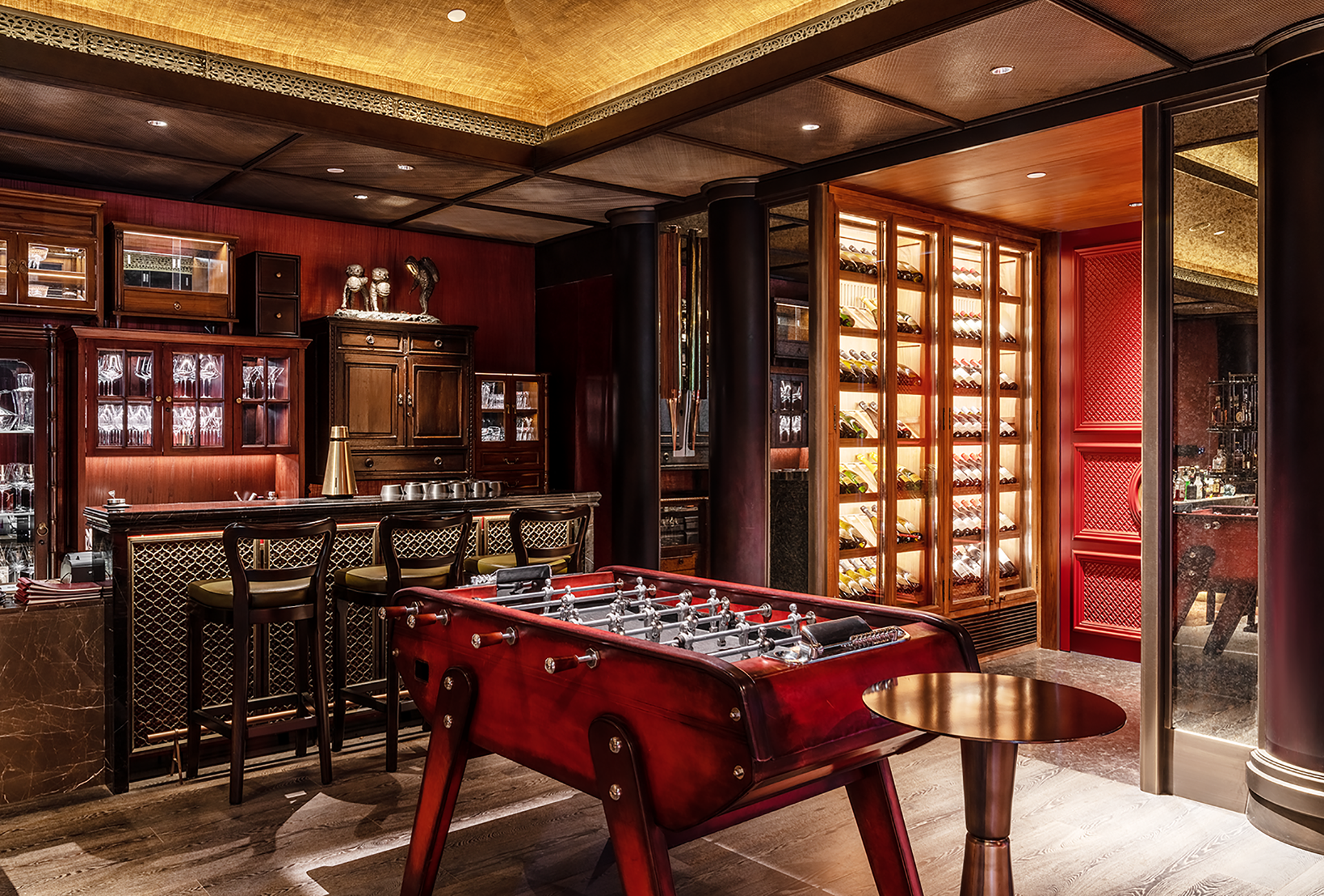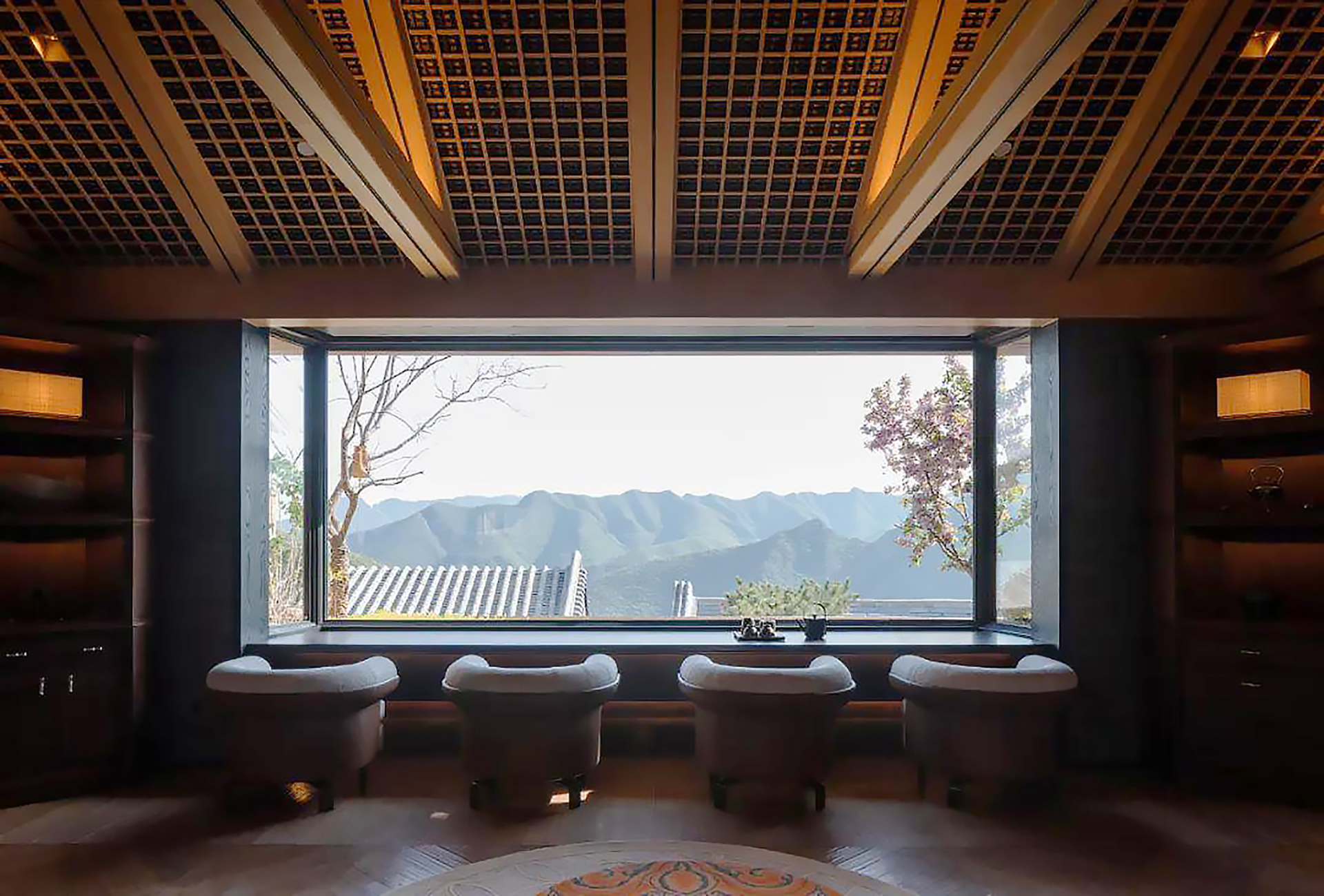 酒店内还设有禅修室、茶空间、餐厅、健身房等休闲场所,以上的公共空间也是整个酒店设计的亮点。休闲空间整体色调以红棕为主,石材奢华质感能够很好的和原木融合。顶部天花区域设计造型各有不同,但可以看出吊顶采取雍容庄重的构架,结合了多种材质组合设计加以合适的线型灯光选型方案打造出丰富形态的创意格调。