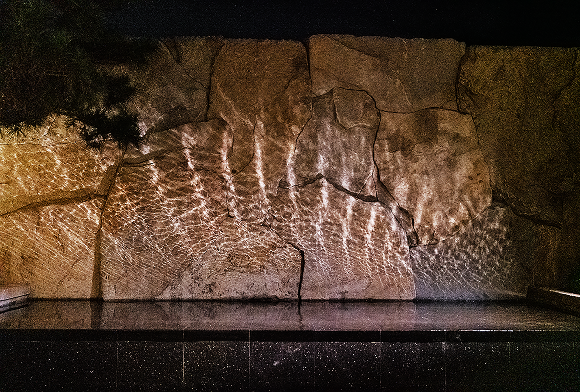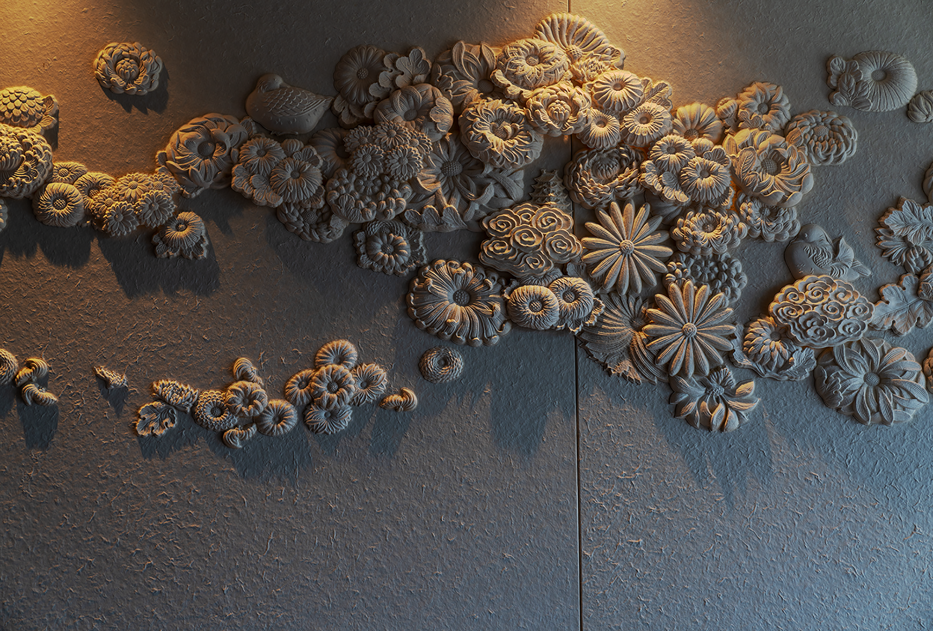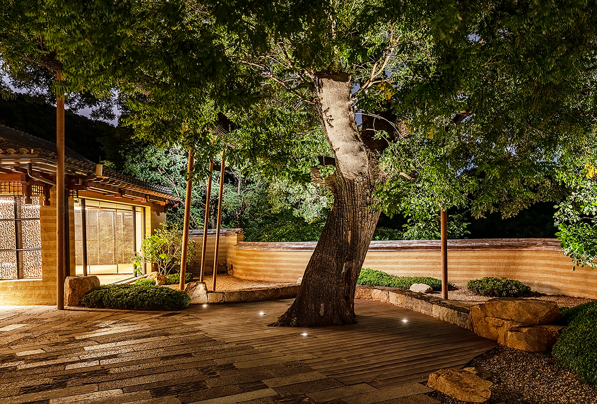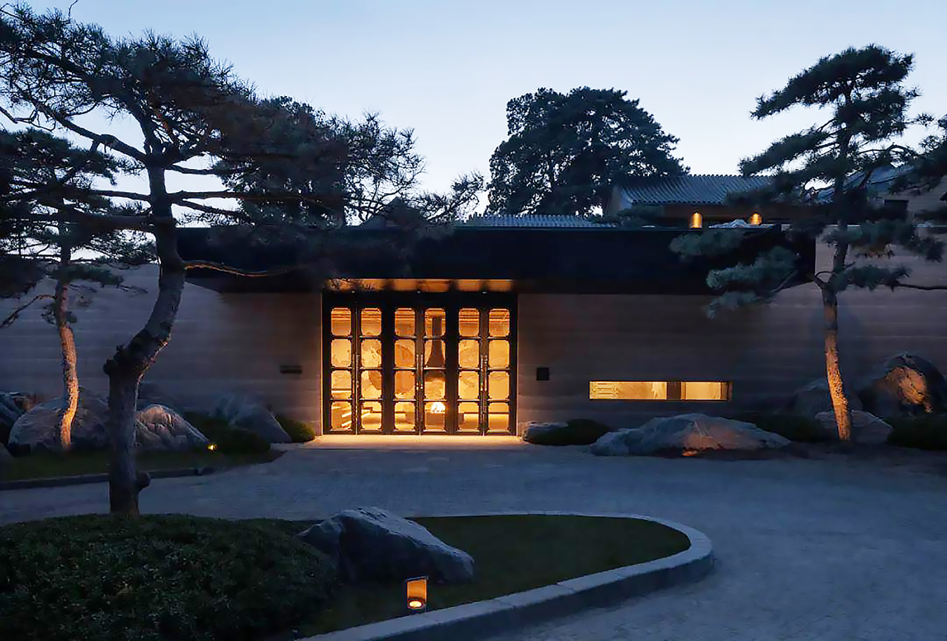 酒店入口处,木艺打造的背景墙“悉昙”二字低调而沉稳;走道处的长青松柏配以暖光漫射,夜幕之下烘托出神秘之感。