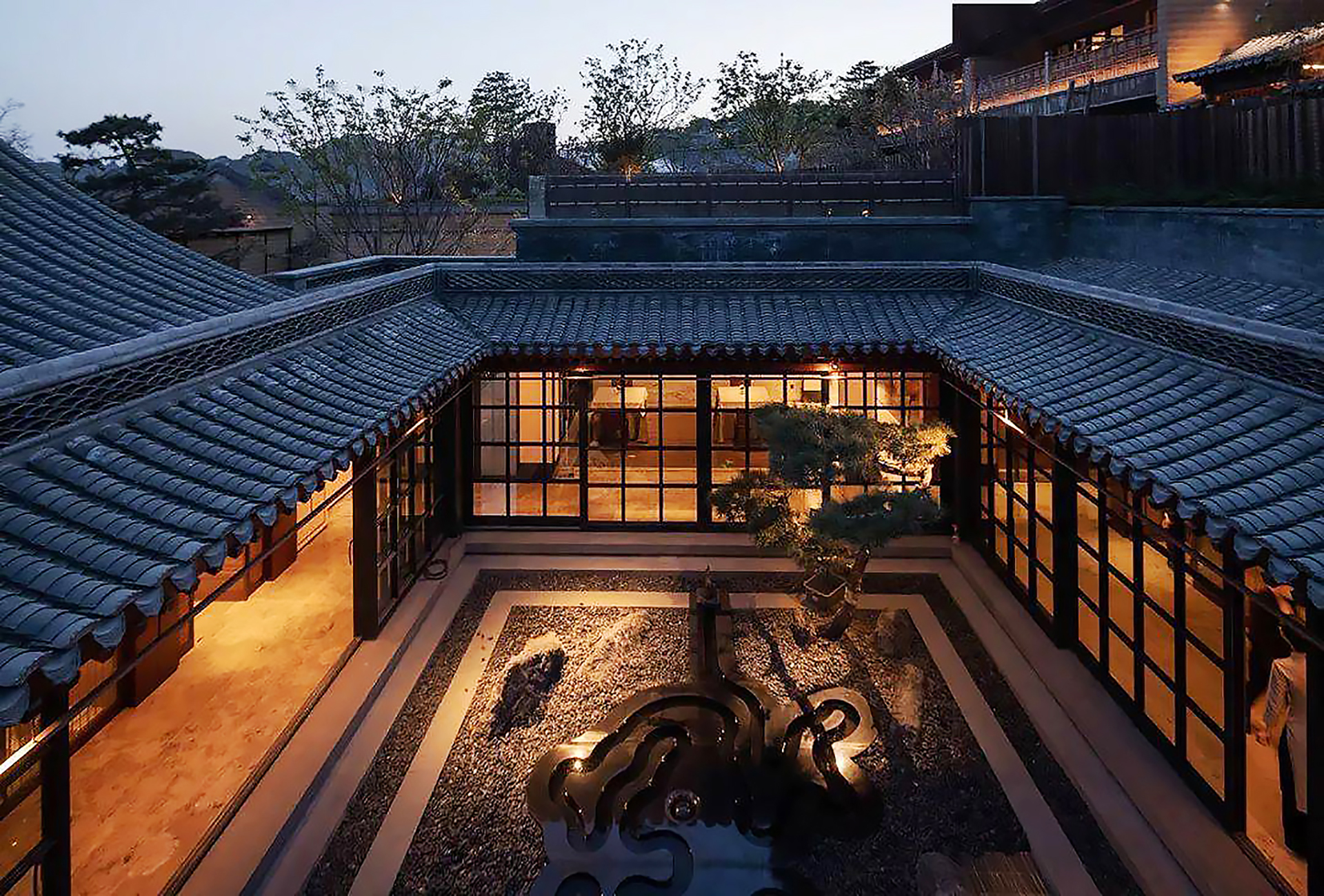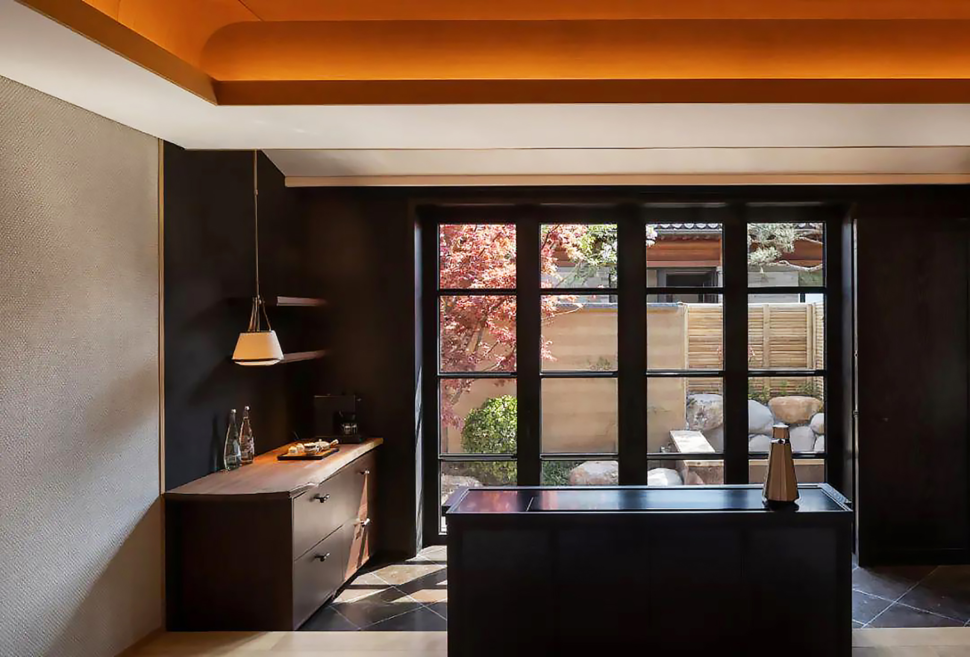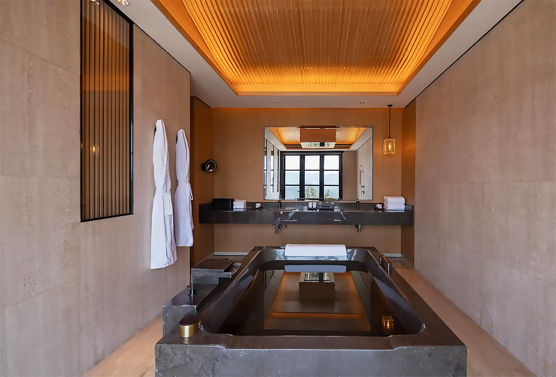 作为酒店,客房当是最重要的空间之一,必须做到让客人感到宾至如归。所以,设计师们将悉昙酒店的古雅客房院落划分为一院一景,藏于大自然的建筑与别致的东方意境交融,使客人除了歇息睡眠外的时间同样身心放松。于空间营造来说,客房内合适的灯光选型就显得尤为重要,灯光与设计相融合营造氛围感及划分空间感,设计师还将多元素(玻璃、火炉、夯土、金属、木材)融入其中,呈现宁静栖心的世界。客房天花基本是采用了暖色光,利用复合式天花设计将灯带隐藏其中,形成环绕式照明,打造不一样的朦胧美感。柔和的光与合适的照度给来到这里的人们慢慢放下束缚,感受随性和安然。