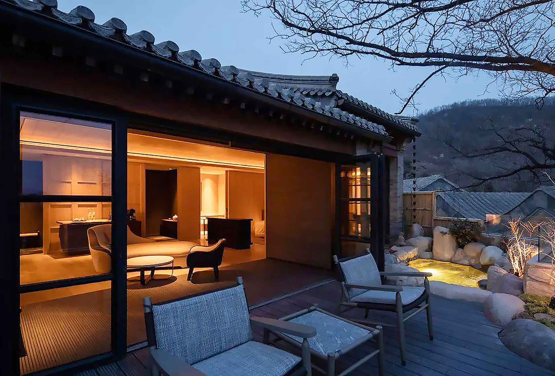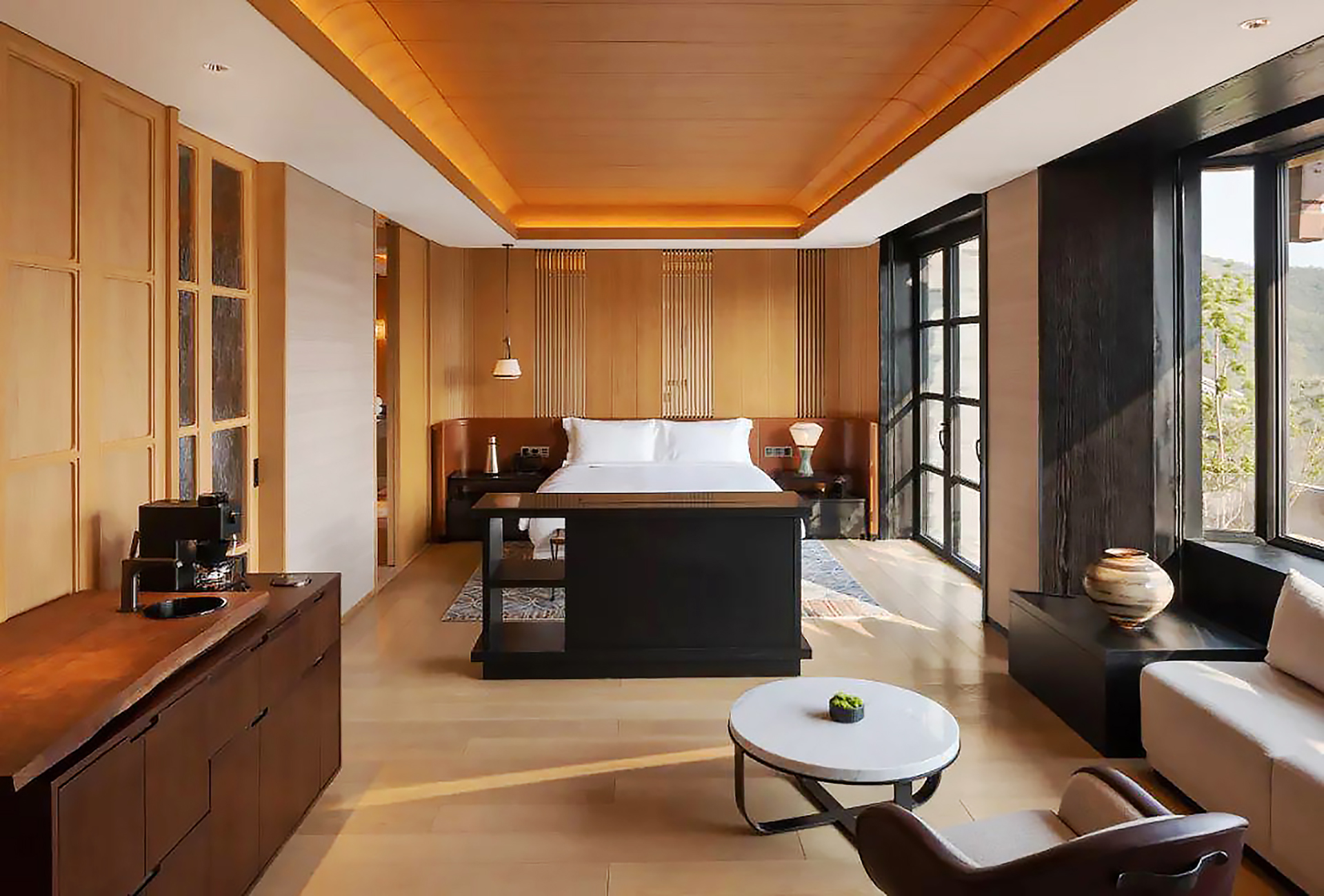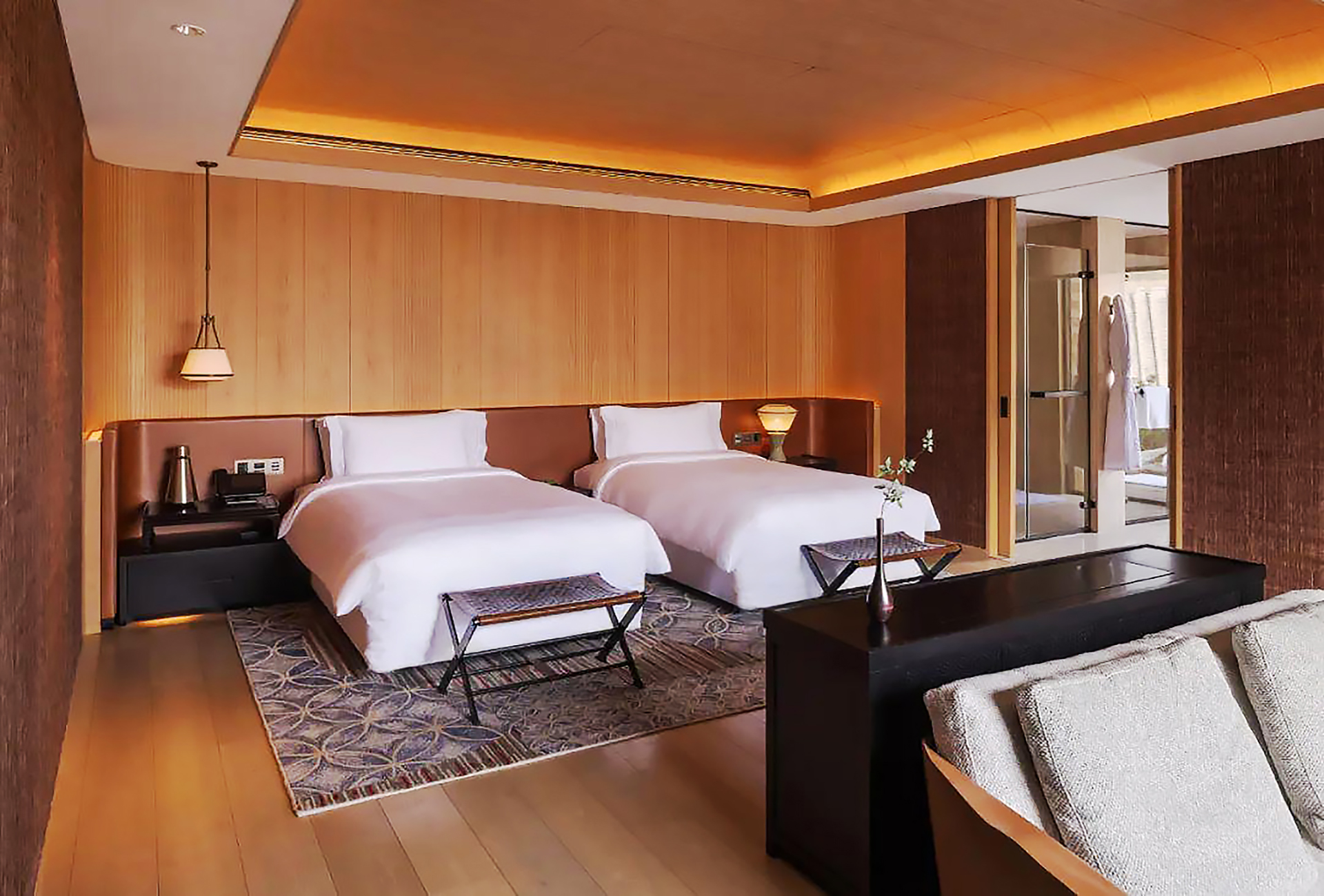 作为酒店,客房当是最重要的空间之一,必须做到让客人感到宾至如归。所以,设计师们将悉昙酒店的古雅客房院落划分为一院一景,藏于大自然的建筑与别致的东方意境交融,使客人除了歇息睡眠外的时间同样身心放松。于空间营造来说,客房内合适的灯光选型就显得尤为重要,灯光与设计相融合营造氛围感及划分空间感,设计师还将多元素(玻璃、火炉、夯土、金属、木材)融入其中,呈现宁静栖心的世界。客房天花基本是采用了暖色光,利用复合式天花设计将灯带隐藏其中,形成环绕式照明,打造不一样的朦胧美感。柔和的光与合适的照度给来到这里的人们慢慢放下束缚,感受随性和安然。