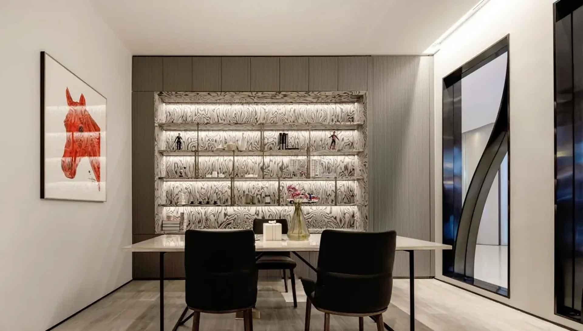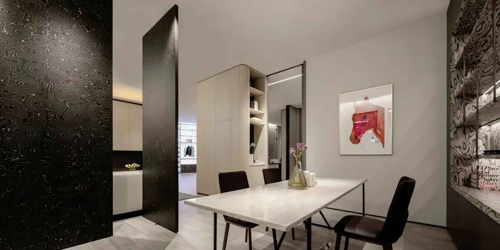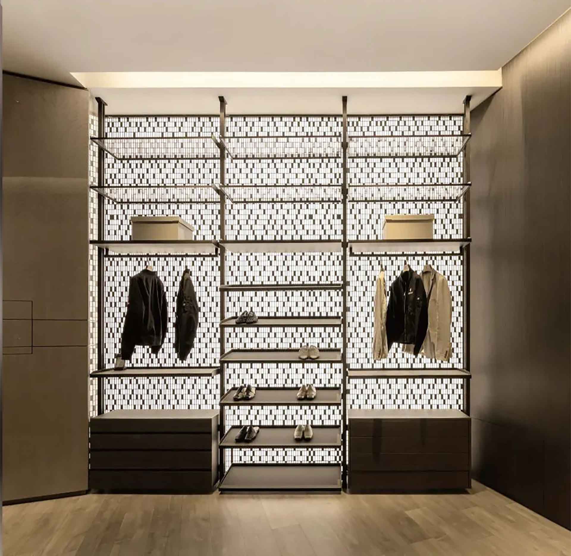 来到展厅的内部,我们可以看到曲线分割具有空间界面与美学韵律的相结合,线型灯的光照完美融合于这玲珑之形,石材质感的背景墙转角处的灯带既可以作为主要照明,又可以将墙表现线条感,在空间中突出重点。衣帽间用了通透疏朗的大面积背景照明,刻画出衣物的剪影轮廓。