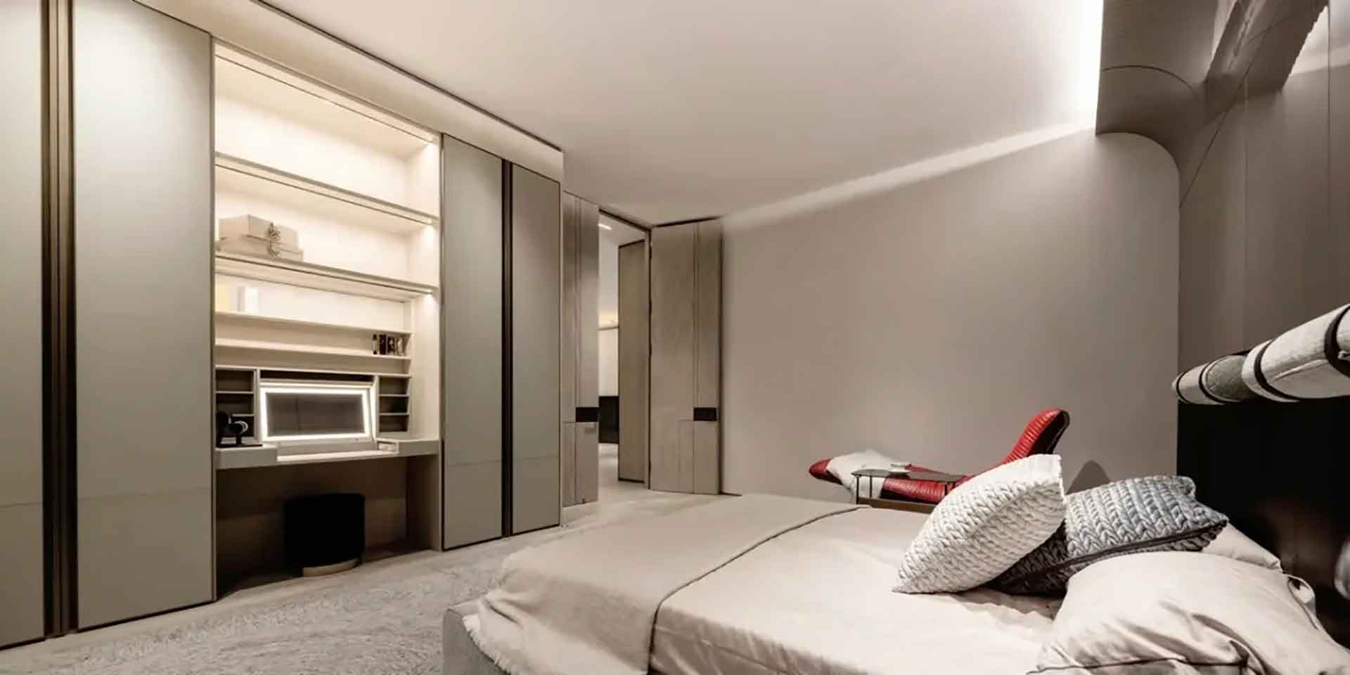 来到衣帽间的灯光应用,我们可以看到设计师的独具匠心。衣帽间运用不同的线型光将空间用几何步入式划分,柜中每处光线简约而不简单,用简洁的视觉效果营造出前卫的家居氛围,以灯光融合环境呈现出不一样的高雅感。