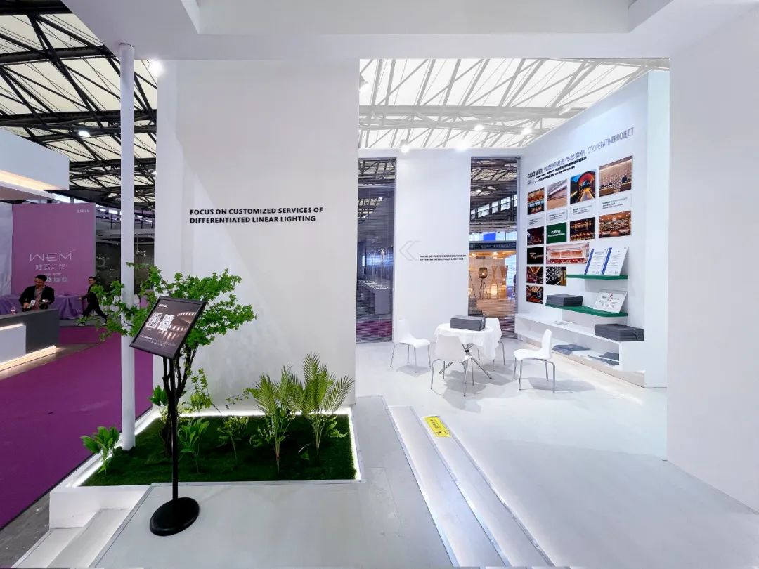 此次上海国际酒店展GUOWIN国盈的展厅设计还是一如既往的极具品牌辨识度,展厅沿用了品牌VI主色调作为整体颜色基调,搭配大面积的纯白墙面,再加以各种细节点缀,重要的是在展厅内每个不同的空间让我们的主角——差异化线型照明(GUOWINFNN霓虹系列1010)巧妙贯穿于全展厅内,做到了让光产品与建材建筑的完美融合。
