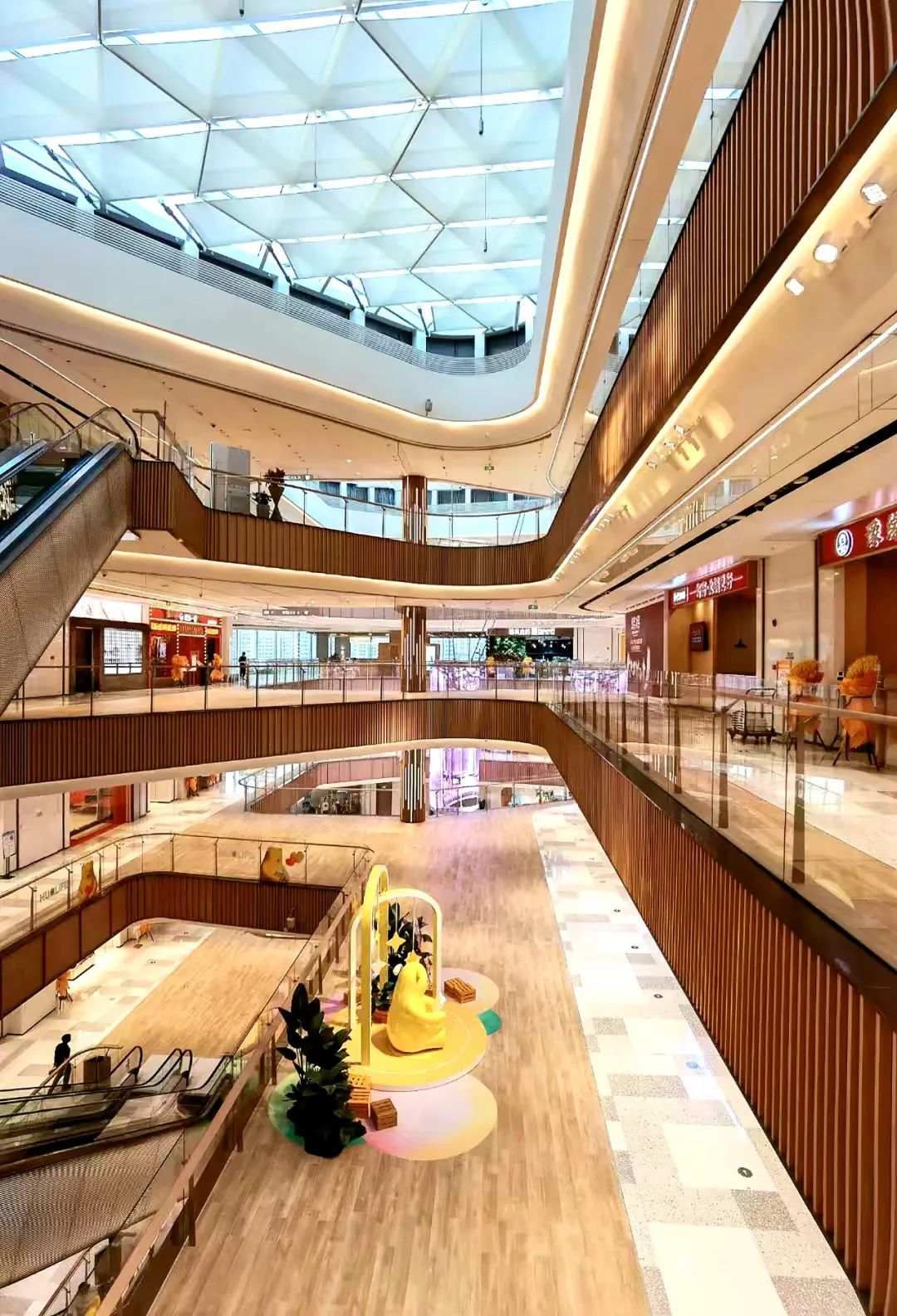 ③商业空间:通常商场中庭整体风格以简约线条为主,通过线型照明,完美地勾勒出流线型轮廓,实现各楼层空间的完美对接。从环宇坊案例我们可以看到GUOWIN透镜系列星耀Ⅱ33灯单灯单剪既提供了基础照明,又装饰了空间,丰富而灵动。天花用线型灯构建空间轮廓感,营造艺术氛围, 装饰空间层次分明,整体营造舒适的光环境。顶部艺术玻璃衔接线型照明灯光形成对称美,将商场垂直空间进行多角度切分,打造建筑空间对称之美。