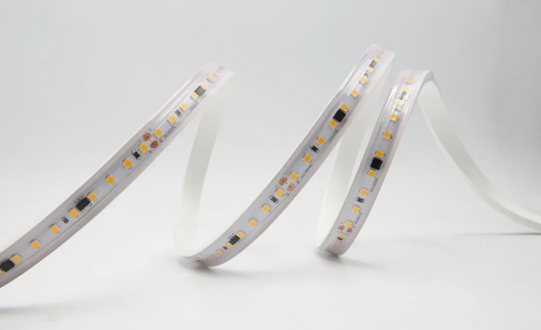 ①高压灯带 特点:高压灯带作为市面常见的灯带之一,高压系列产品采用的220V的电压工作,市面上多数的高压灯带需要高压驱动器来带动,而GUOWIN的高压产品无需加装高压驱动,接通220V的电源就即可正常进行照明工作。GUOWIN高压系列灯带还有一款更让人惊喜的亮点,就是在于它的“自感应温控”,“自感应温控”的意思就是当IC温度过高时,会自动把限流点调低,以此来防止温度过高而出现安全隐患。这也是我们多项GUOWIN专利产品中的其中一项特色产品。高压系列的产品款式也包括了我们之前介绍的系列,有挤出高压、霓虹高压、透镜高压、COB高压等。