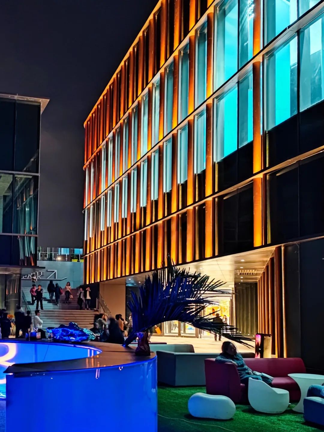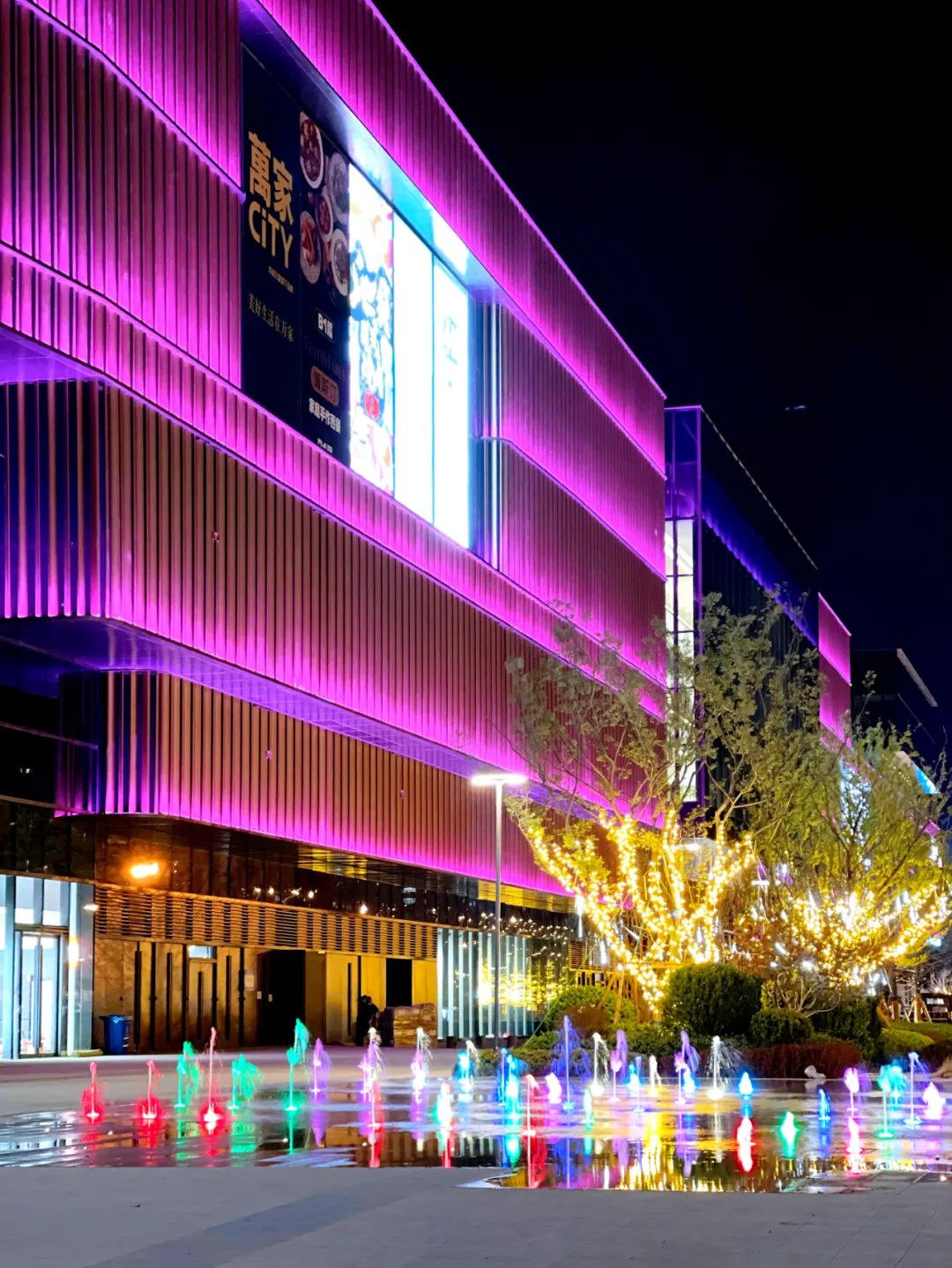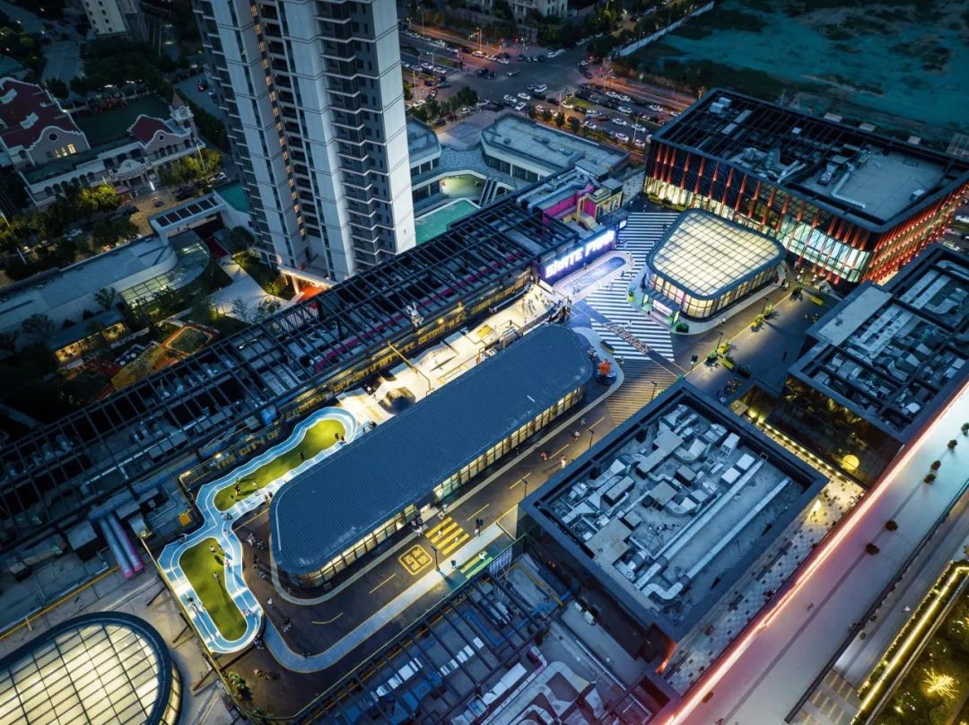 上洗墙的照明方式,在夜色中与商场外休闲空间花园景观露台遥相呼应,若隐若现的肌理幕墙形成多层次的光影变化。