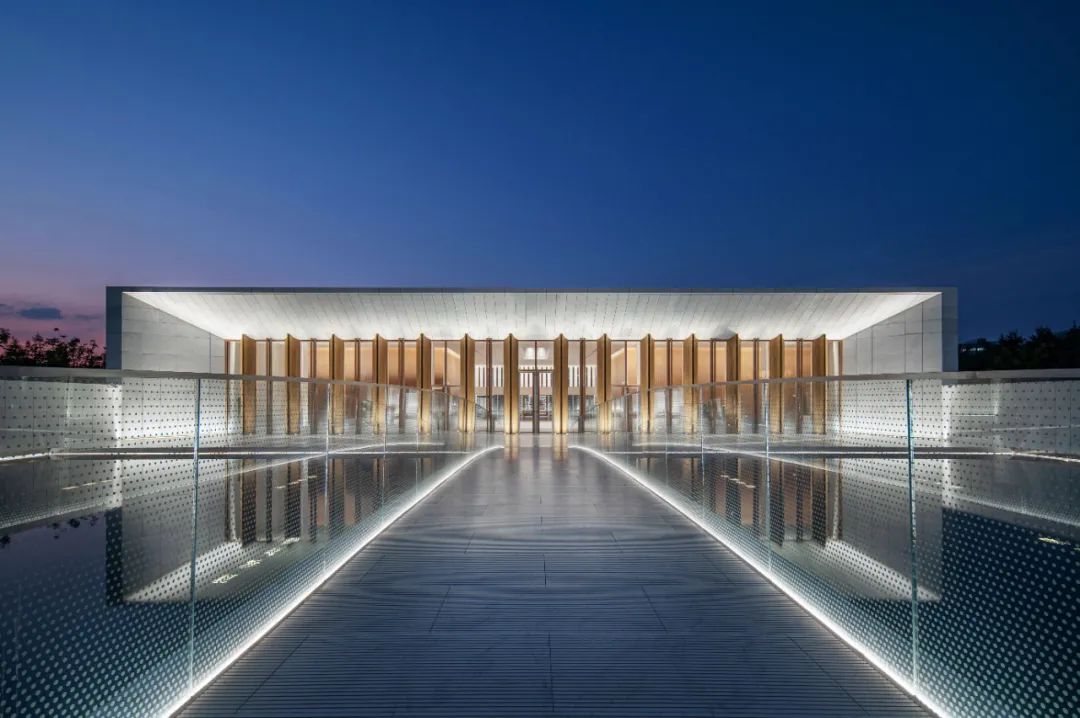 沿着长廊一直往前走就是南北走向的主轴线桥梁,作为上海奉贤博物馆一体两翼的重要构成,桥面通过线型光氛围营造,将建筑、艺术与科技和谐相融。