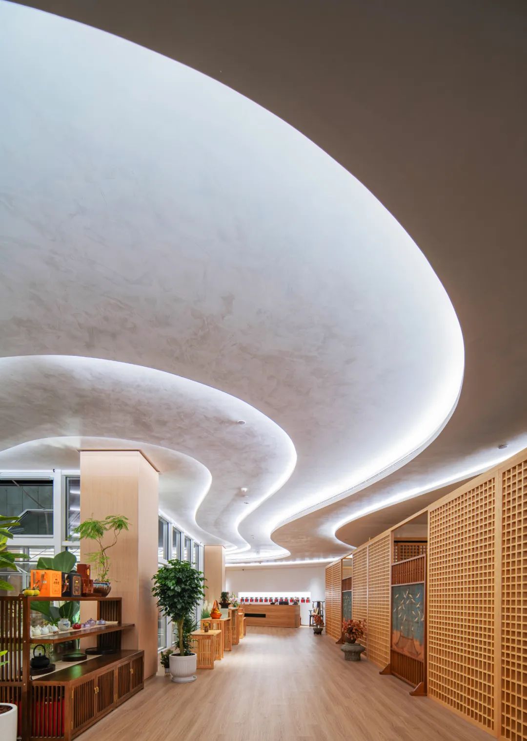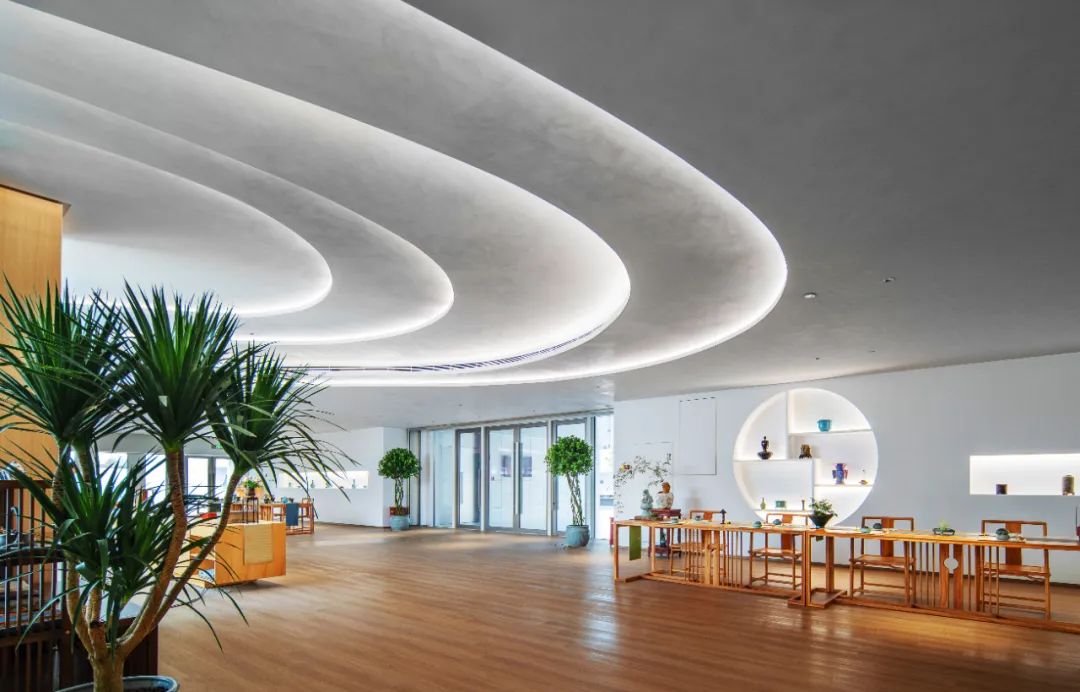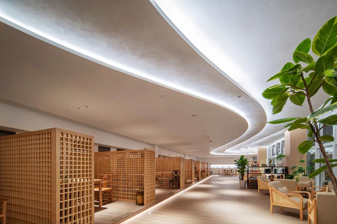 进入到言子书院内部,“那里”茶坊作为言子书院最静谧、安逸的深处,绿荫环绕。茶坊室内天花上以大范围内藏线型光作氛围照明,光影层次分明,环境柔和静谧,令人置身于光影与茶香之间享受片刻宁静。